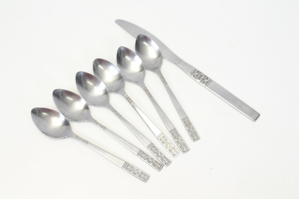 Customcraft Fleur De Lis Teaspoons + Dinner Knife Stainless Lot of 7