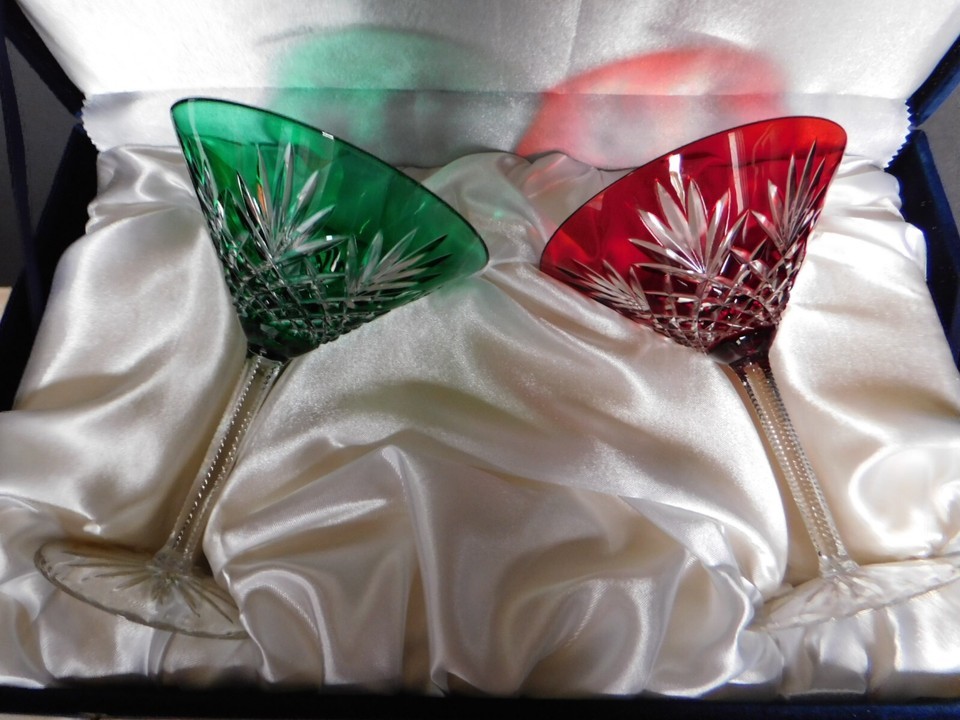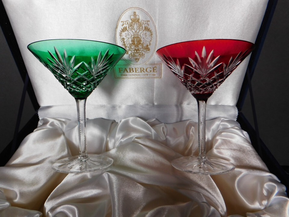 This is a set of 2 Faberge Martini Glasses. Made in Slovenia. These glasses measure 6 3/8" H x 5" Wide at outer rim. Faberge etched on bases. These two Martini Glasses come in the Faberge Presentation Case. We ship Worldwide fully insured with signature required upon delivery.