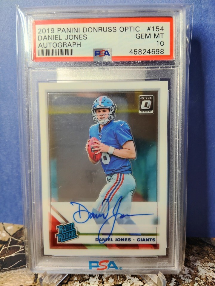 The product is a highly sought-after 2019 Donruss Optic Football trading card featuring an autograph of Daniel Jones, graded PSA 10 with a population of only 12. This rare card is a valuable collectible for fans of football and sports trading cards, showcasing the talented player in a limited edition Optic parallel variety set from Donruss. Perfect for serious collectors looking to add a unique and high-quality piece to their collection.
