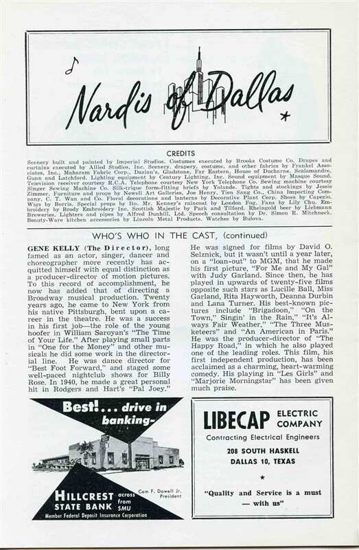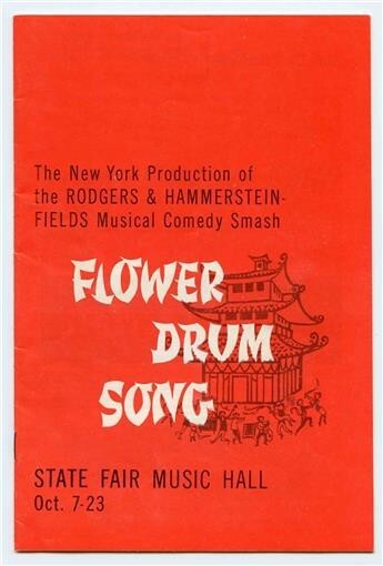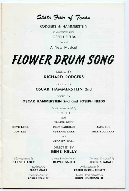 A Flower Drum Song Program. From the State Fair Music HAll in Dallas Texas in 1961 Starring Elaine Dunne, Jack Soo, Cely Carrillo, Jon Lee Juanita Hall and, Keye Luke. Filled with biographies and more. Directed by Gene Kelly.