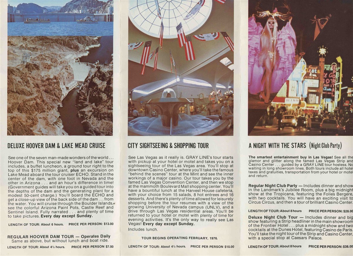 A full color 8 panel fold out. The Gray Line Las Vegas Sightseeing Tours Brochure , dated 1975.
