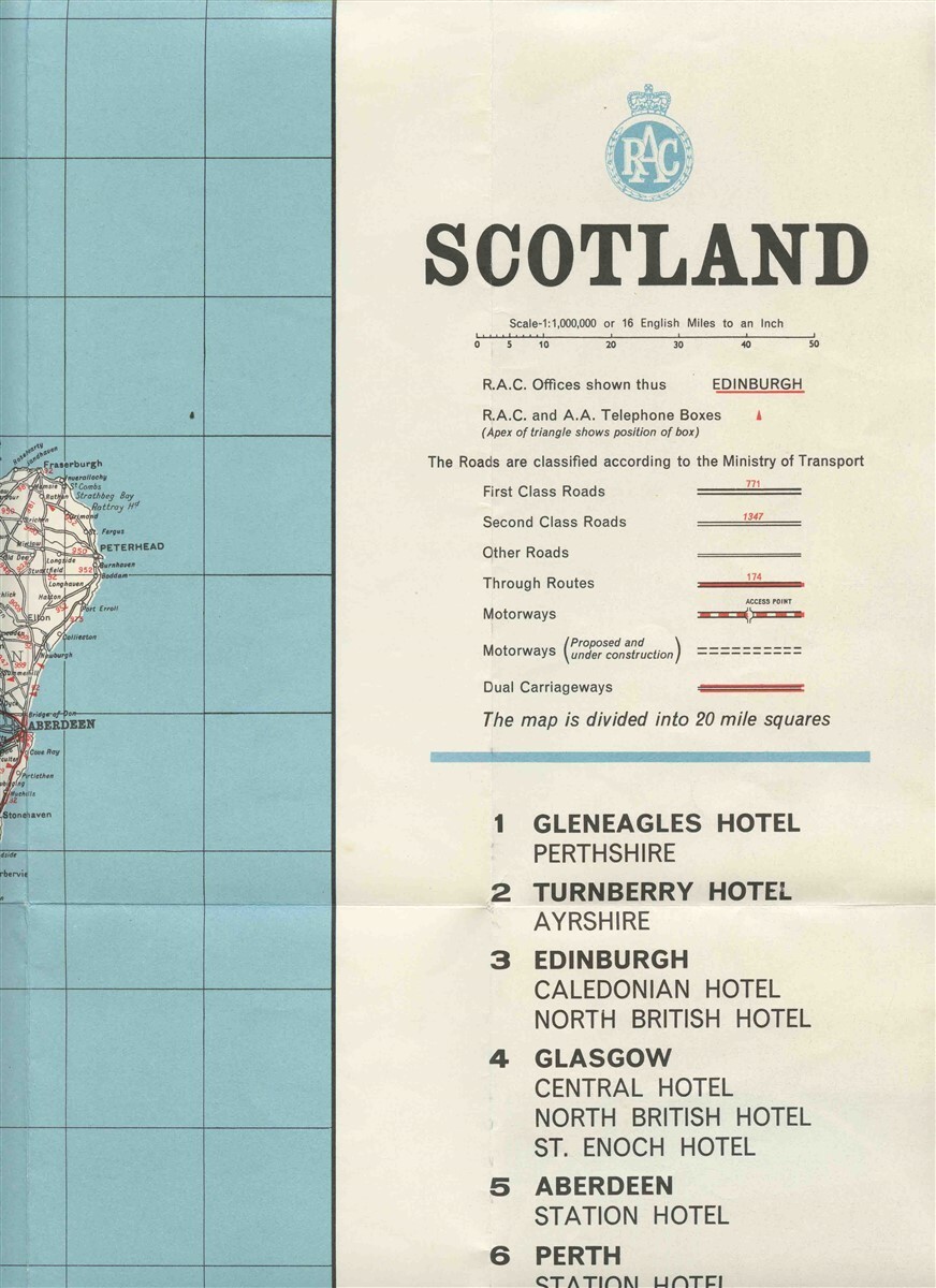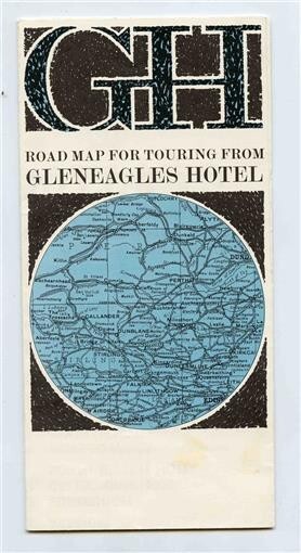Opens to about 17" x 23" and is blank on the back except for the cover image. Road Map for Touring from Gleneagles Hotel. Has a large color map of Scotland with list of major Hotels noted with arrows.