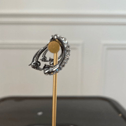 C shaped rhinestone crystal clip on earrings that measure approximately an inch long and a half inch wide. Several rows of rhinestone crystals and gunmetal tone base. I have pierced ears but sometimes with larger earrings for special occasions I prefer the clip on so they don?t drag on my pierced ear too much. These are lovely and sparkly. Used once.