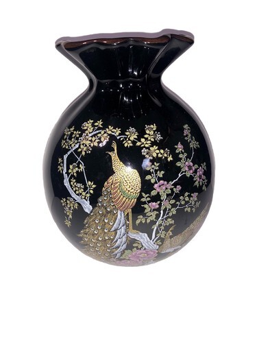 The Vintage Japanese Vase features a stunning black balloon porcelain design with peacock and floral patterns, accented with gold details. This elegant piece originates from Japan and is a beautiful representation of Japanese culture. Perfect for collectors or those looking to add a touch of traditional Japanese craftsmanship to their home decor.