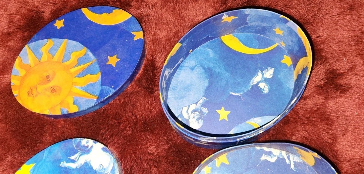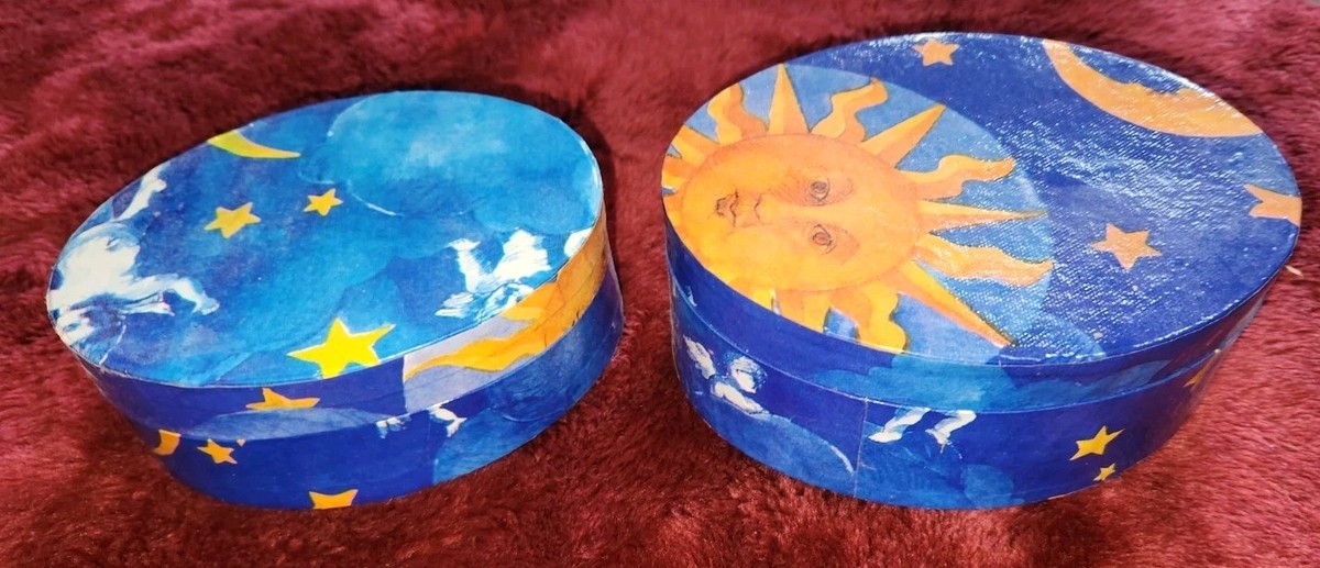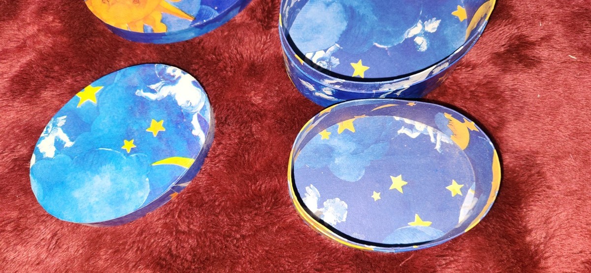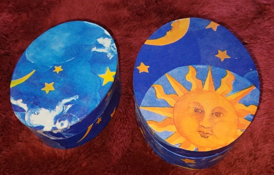 VTG Twos Company Nesting Trinket Boxes Moon Star Sun Cherubs Angels Sky Oval Set