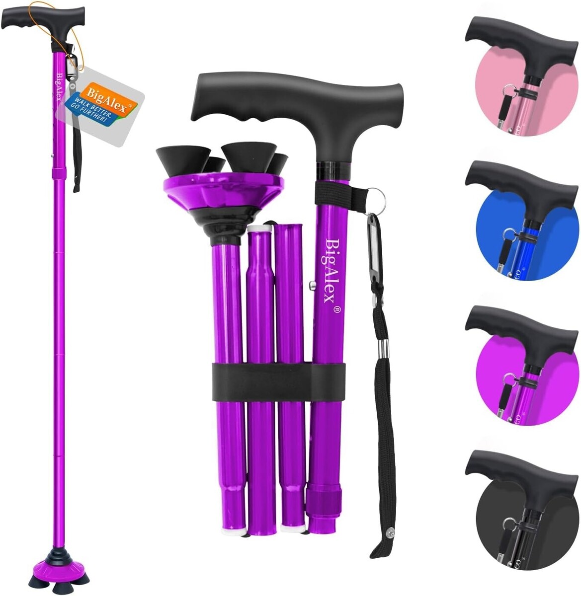 Adjustable Folding Walking Cane with Pivoting Quad Base - Lightweight Portable