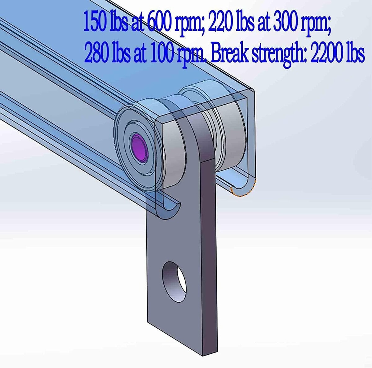 ???Design load?150 lbs at 600 rpm; 220 lbs at 300 rpm; 280 lbs at 100 rpm. Break strength: 2200 lbs