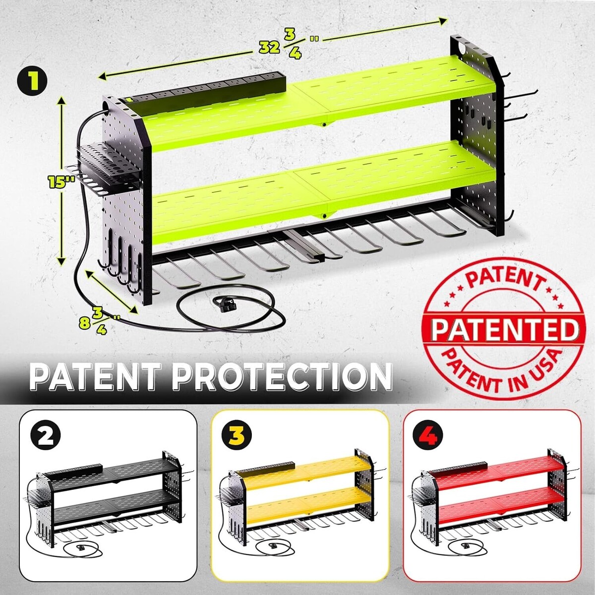 Efficient Storage: The Electric Tool Rack is designed with three tiers and eight dedicated slots to efficiently store your electric tools. The top tier features a built-in charging station, enabling direct charging while tools are power cord is 7 FT long 14AWG,and the charging station is 15A 125VAC 1875W 60Hz.