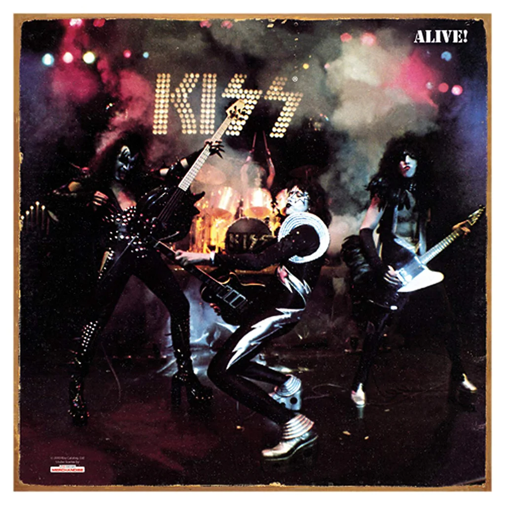 Metal sign that is a replica of Kiss' "Alive" album cover.