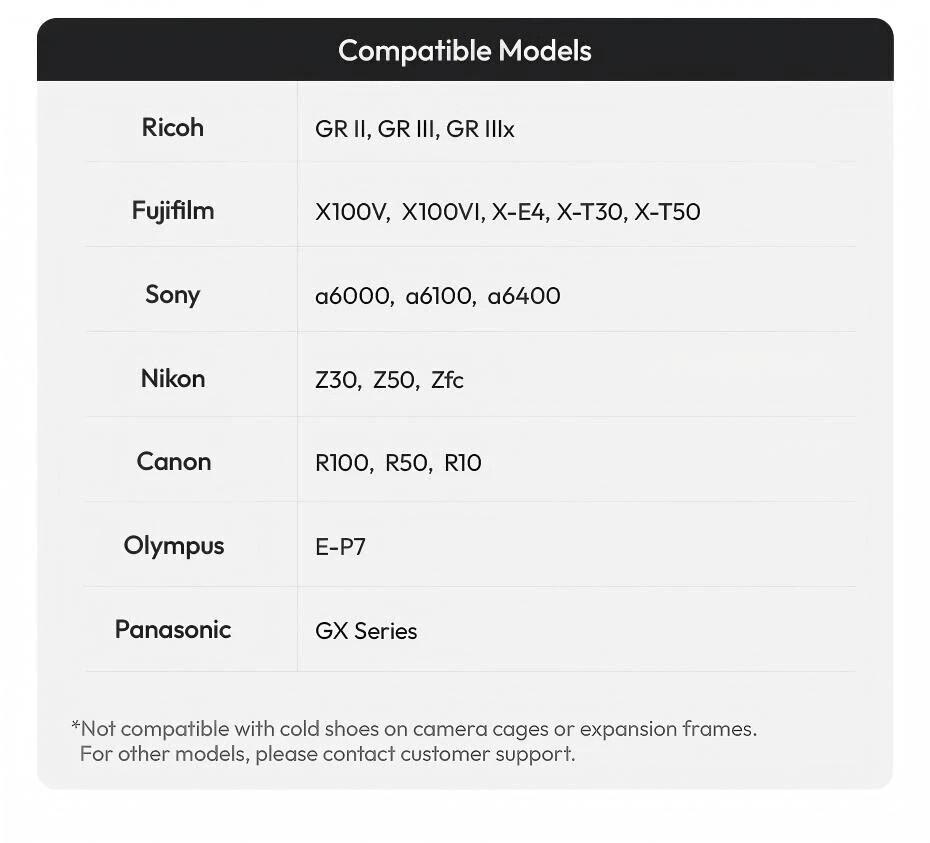 Compatible with most cameras from Sony, Nikon, Canon, Fujifilm, Ricoh, and more.