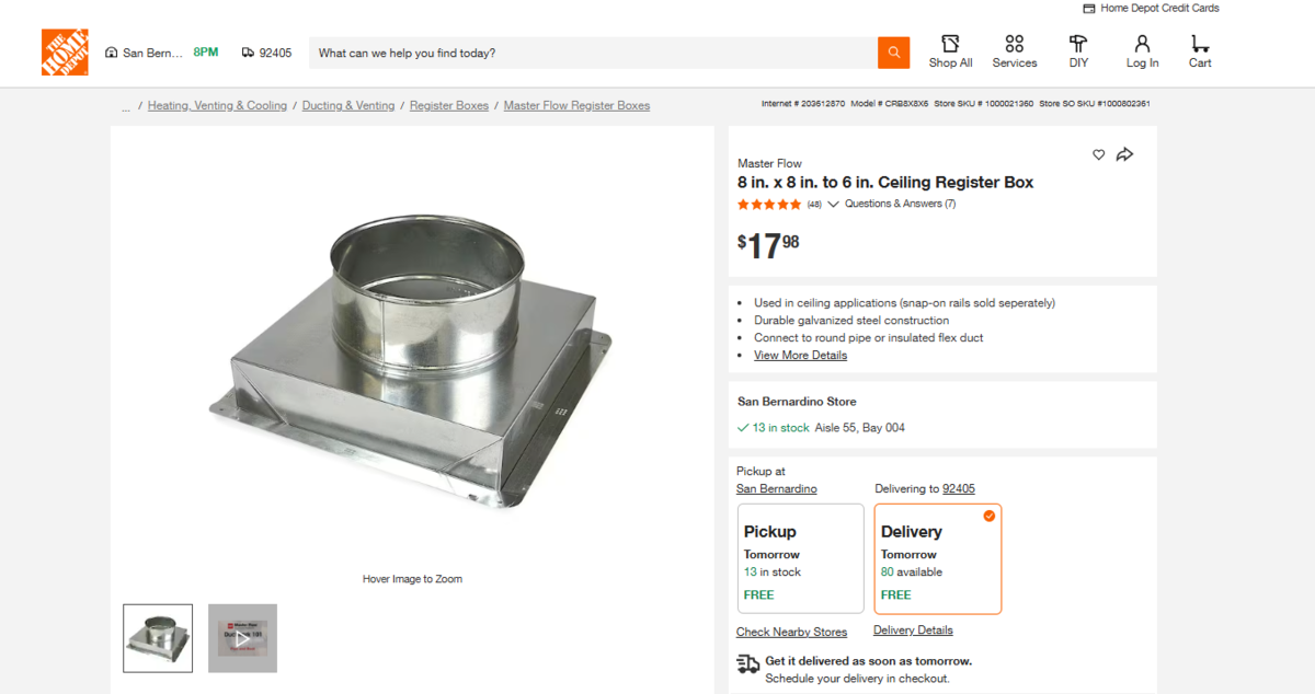 The Master Flow 8 in. x 8 in. to 6 in. Ceiling Register Box features a 30-Gauge, galvanized-steel construction to provide strength and durability. This ceiling register box creates a transition from round pipe or insulated flexible duct to an air register or grille.