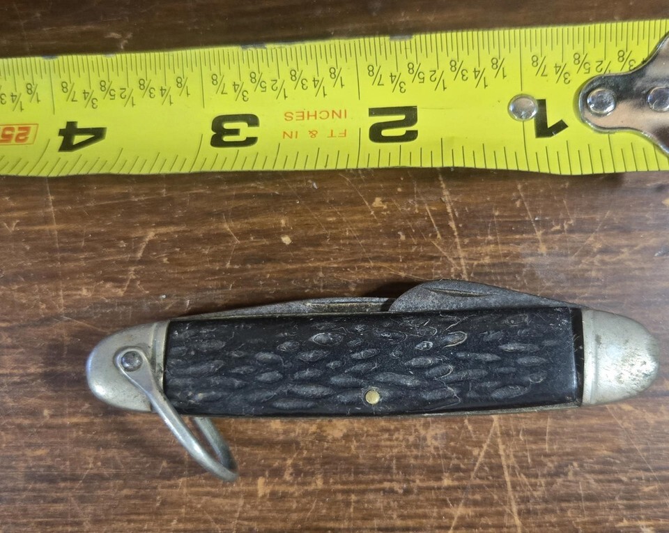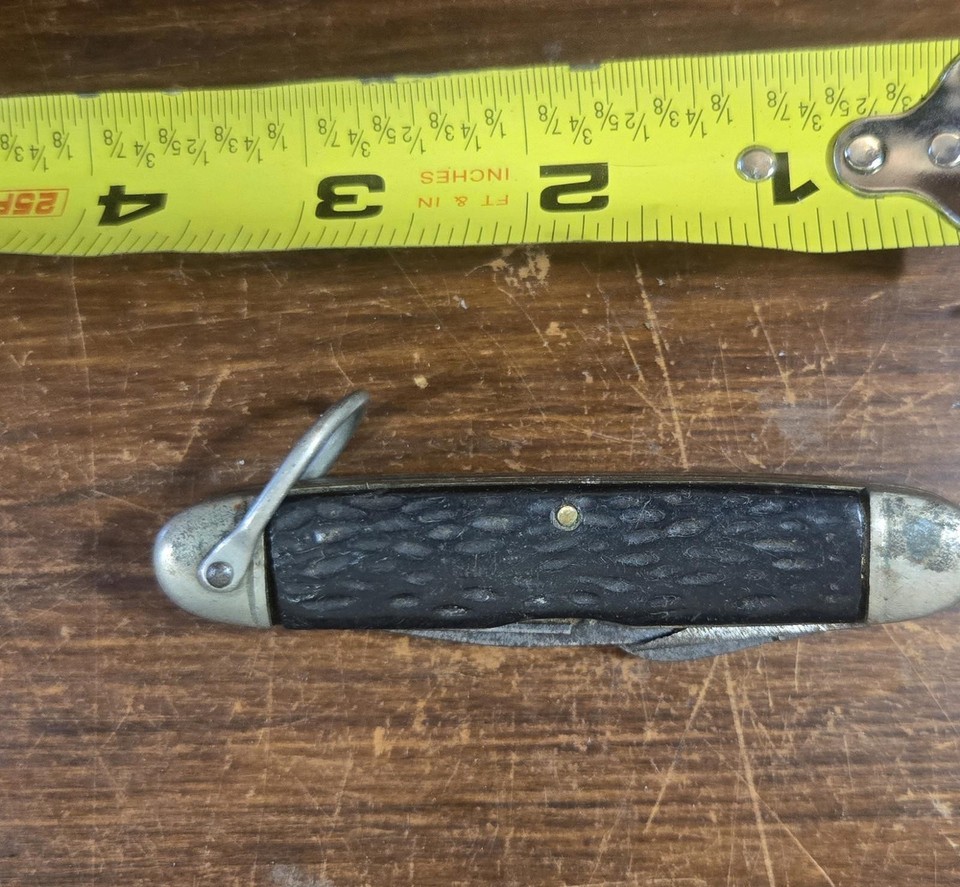 This vintage multi-tool pocket knife features a textured black handle and multiple tools including a blade, bottle opener, and can opener.