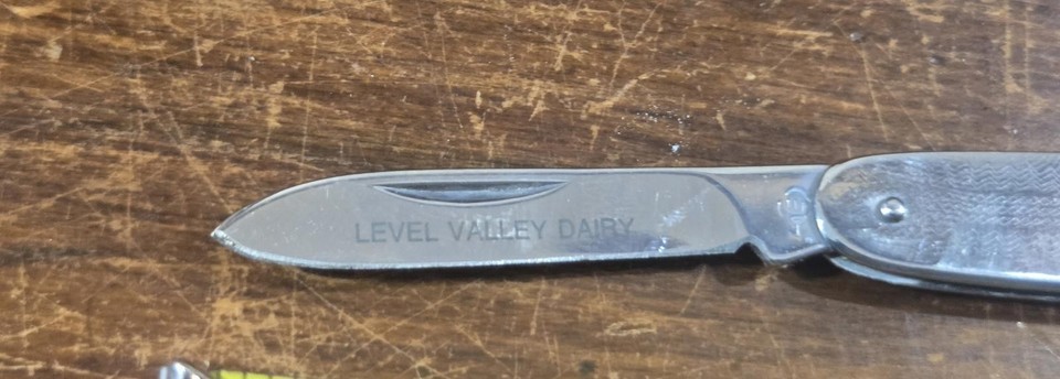 Vintage folding pocket knife with "Level Valley Dairy" engraving on the blade.