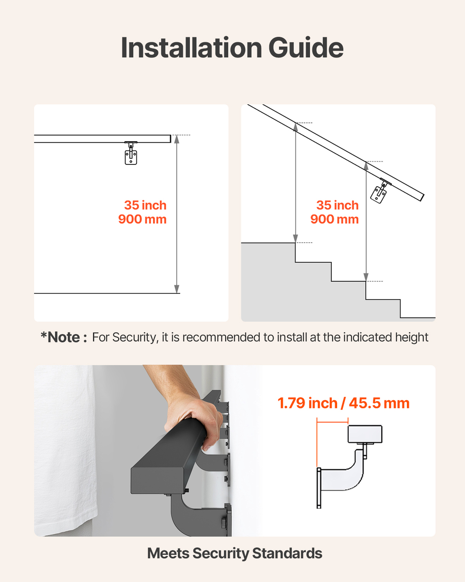 Compatible with Multiple Wall Types: Our stair railing wall mount is designed to be compatible with wood, brick, or concrete walls. We recommend installing the handrail at a height of about 900mm (35 inches) from the ground