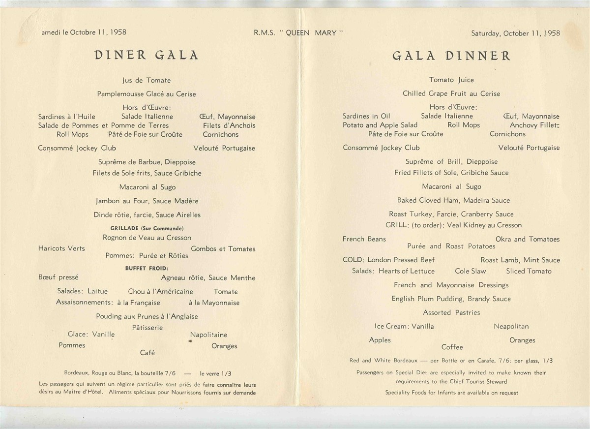 A Gala Dinner menu from the Cunard Liner R M S Queen Mary from Saturday October 11, 1958. In very good condition. Measures about 6" x 8" when closed. The cover is Cunard's R M S Queen Mary