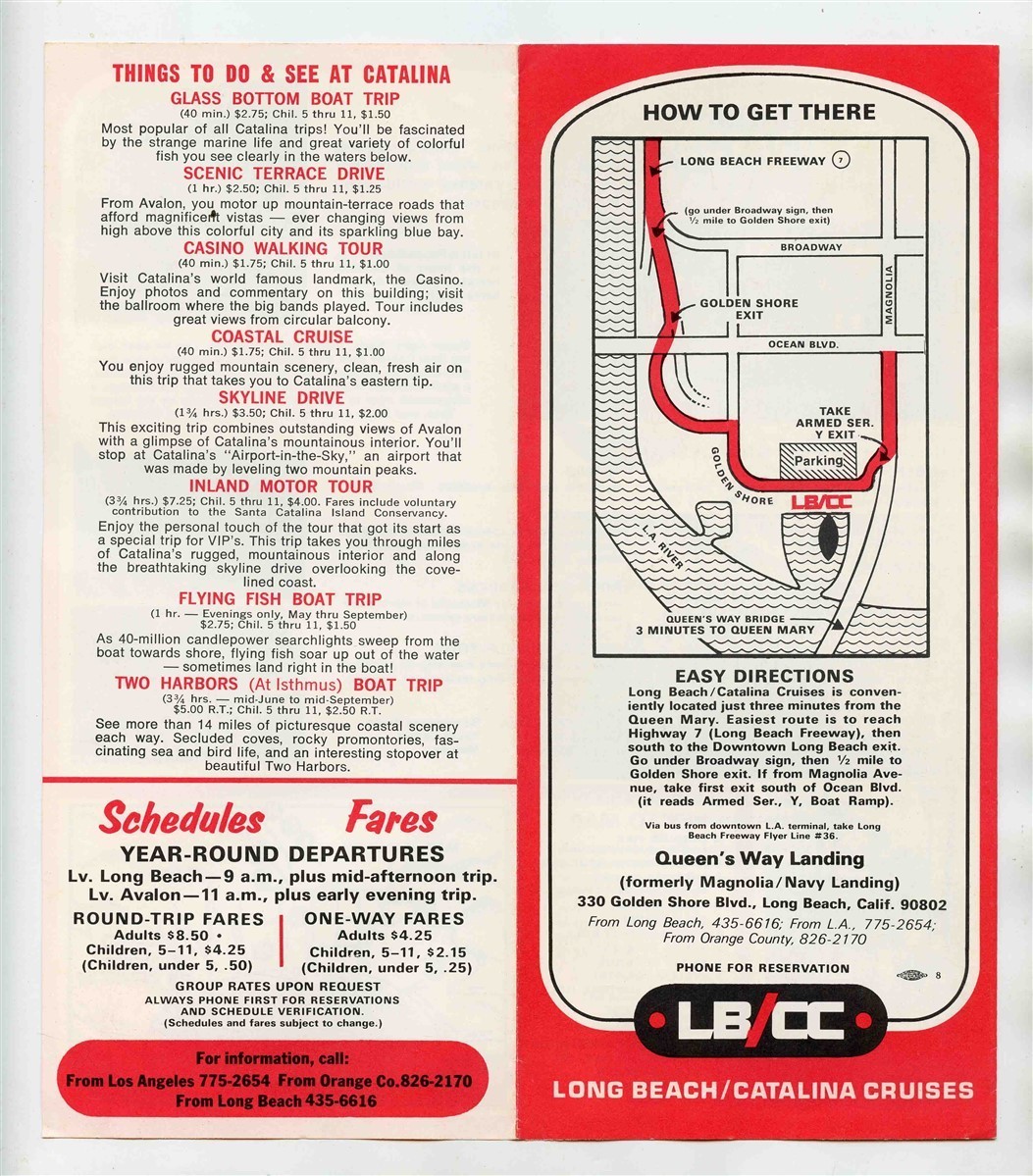 An interesting and well illustrated 6 panel fold out brochure with map, photos, directions, things to see and do and much more. Catalina Island via Long Beach Spectacular Royal Route Cruises Brochure by Long Beach Catalina Cruised. Includes Schedules and Fares, , circa 1950's