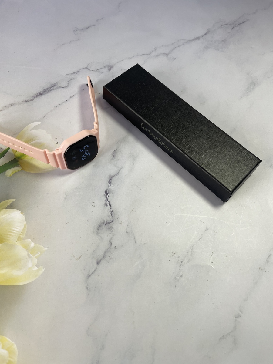 Features a square, minimalist screen with a soft pink silicone strap, combining comfort and contemporary style for everyday wear.