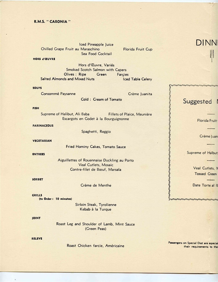 Cunard Lines Dinner Menu R M S Caronia 1954 and similar items