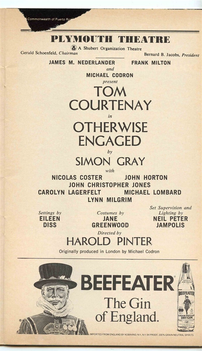 From the Plymouth Theatre in New York City during June 1977 . A Playbill from Otherwise Engaged , starring Tom Courtenay.