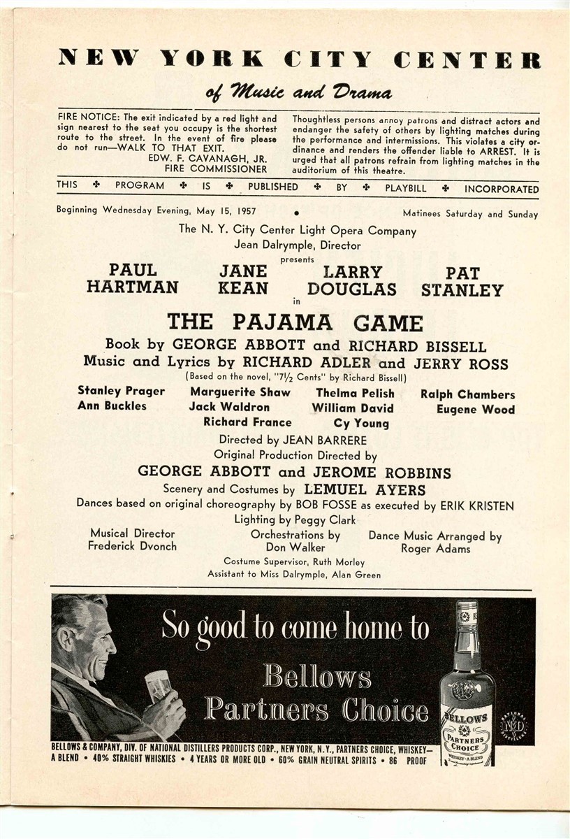 The Pajama Game Program from May 15, 1957 at the New York City Center of Music and Drama, Starring Paul Hartman, Jane Kean, Larry Douglas and Pat Stanley. Galas Spring Musical Season