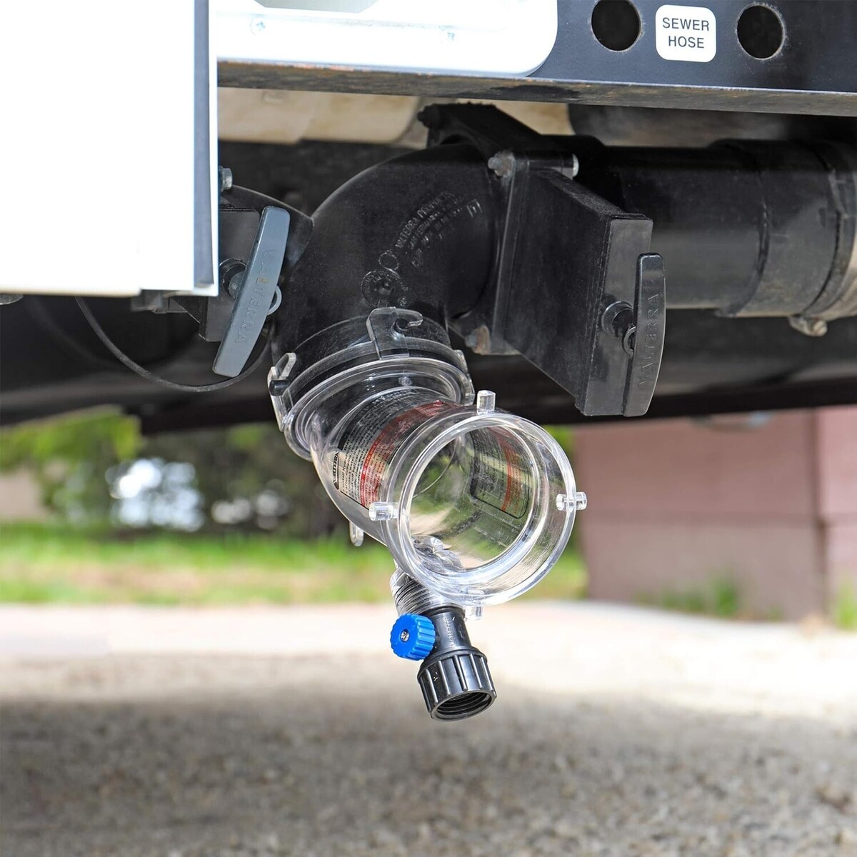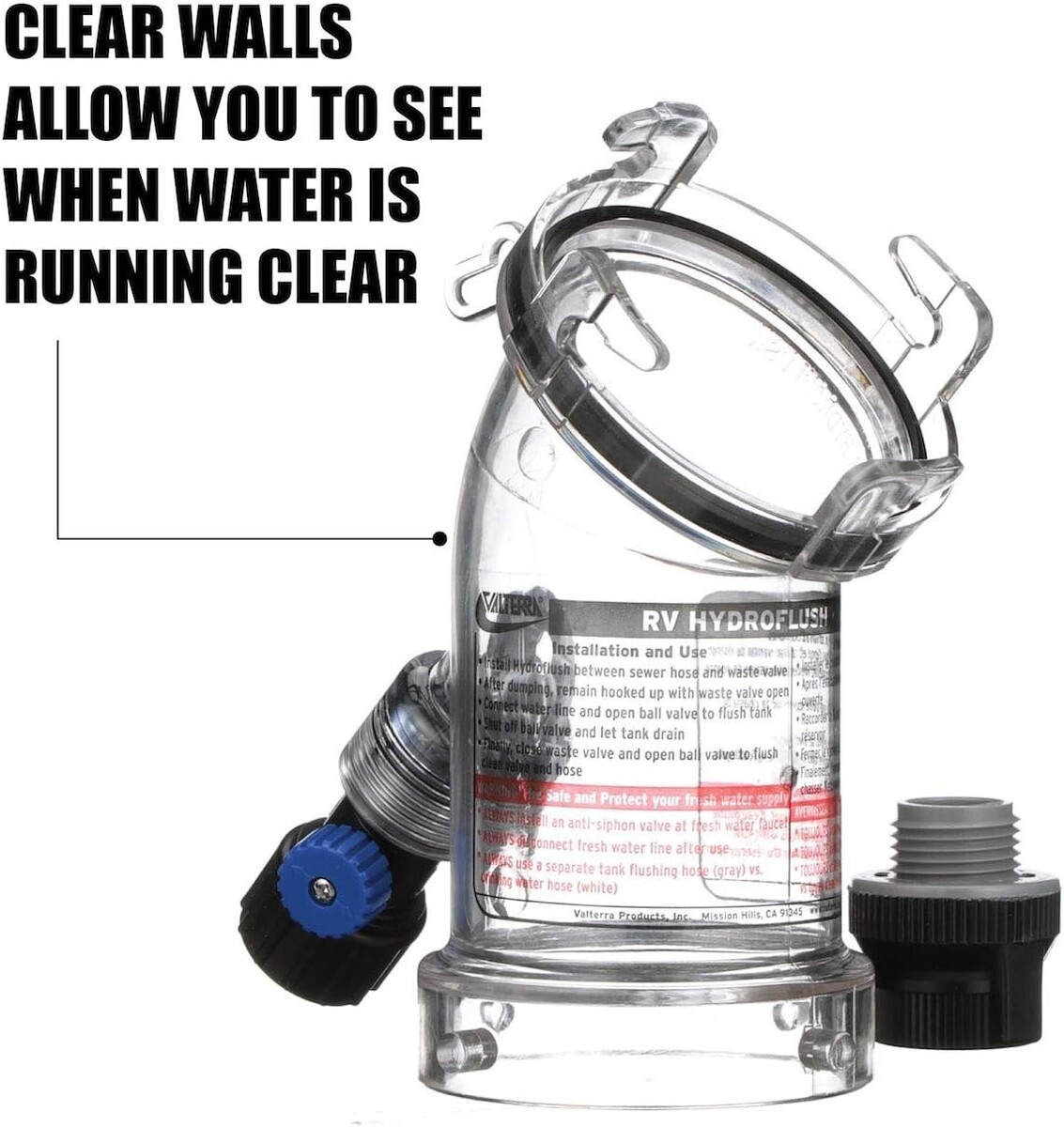 Drain your RV with ease with the Hydroflush! This sewer hose attachment features bayonet fittings to ensure a leak-proof draining experience. The clear construction allows you to see when the water runs clear. With an anti-siphon valve, you can protect your fresh water supply from possible backflow. The water flow from this valve helps break up plugged tanks and cleans tank, pipe, valve, and drain hose. Easy to install and use, the Hydroflush is the perfect addition to any camper, RV, or trailer.