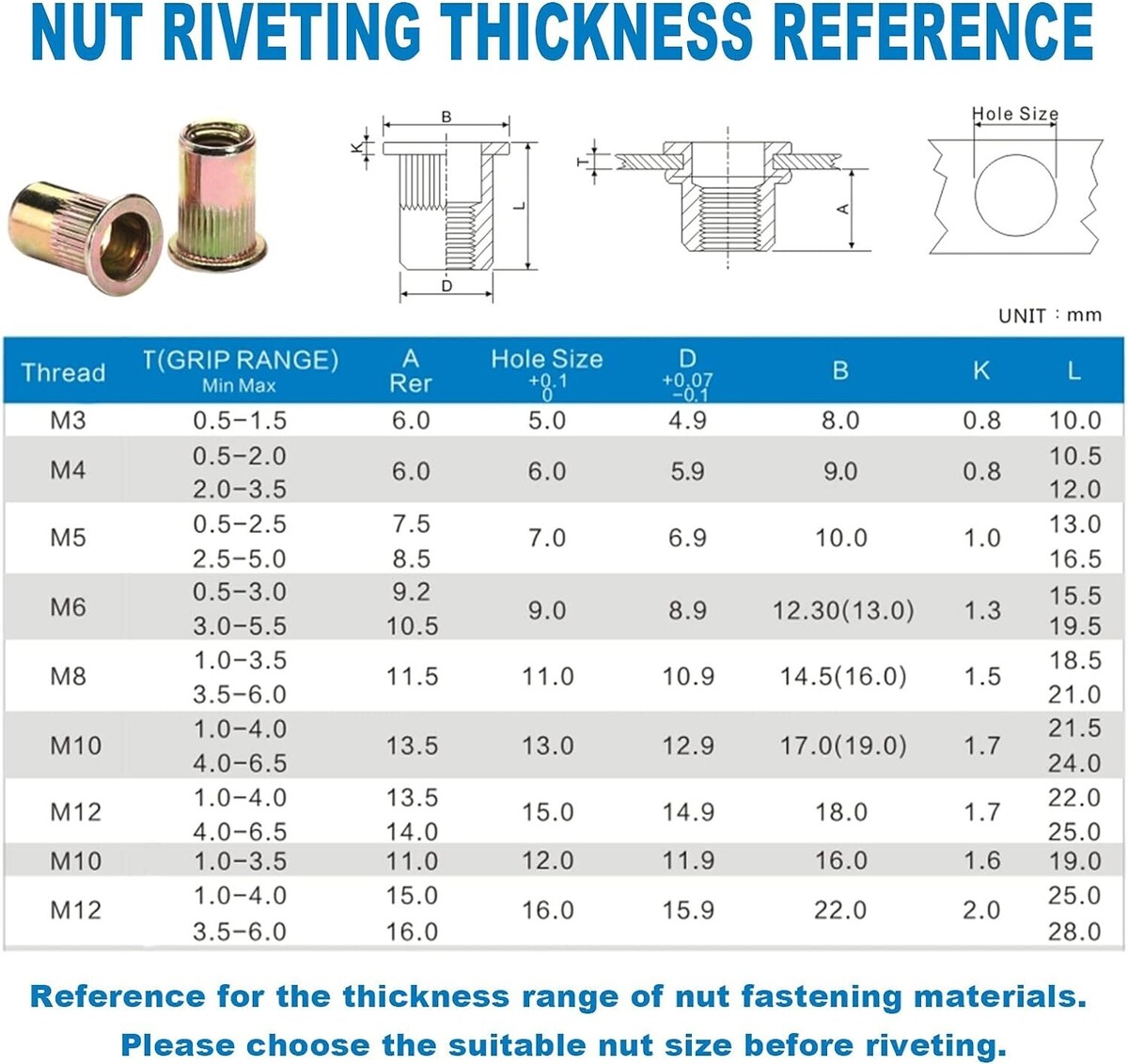 Complete Accessories: 11PCS Metric and SAE interchangeable mandrels(Metric M3 M4 M5 M6 M8 M10 M12; SAE 10-24, 1/4-20, 5/16-18, 3/8-16) , 110pcs rivet nuts, a multi-function wrench, and a sturdy carrying case. All the tools and accessories can be placed in case. Easy to carry and accessories are not easy to lose