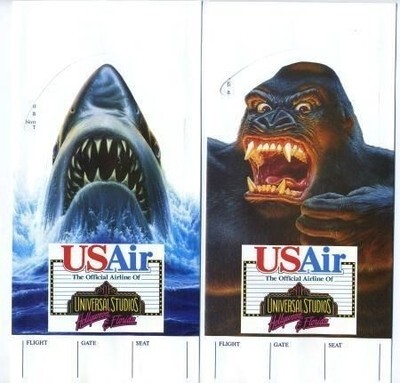 4 different unused ticket jackets from USAIR. Each features a character from a Universal Studios film. Includes Woody Woodpecker, King Kong, Fievel and The Shark from Jaws