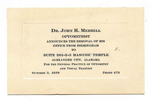 A 3 1/2" x 5 1/2" single sided business card. Dr. John H Merrell Optometrist, Announces the Removal of his Business from Birmingham to Alexander City Alabama in the Masonic Temple . Dated 1938