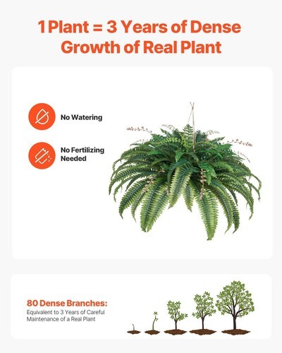 Lush Branches: Our large artificial ferns feature dense branches that create a vibrant, full look. One plant's density is equivalent to a real fern nurtured for 3 years. Plus, no worries about watering, fertilizing, or weeding-enjoy lush greenery year-round
