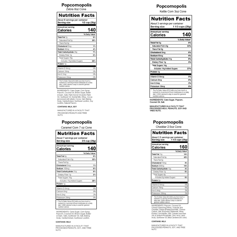 6 ? (7 oz) Caramel Corn 6 ? (2.5 oz) Cheddar Cheese 6 ? (3 oz) Kettle Corn 6 ? (8 oz) Zebra Popcorn 24 tall cones total: TOTAL NET WT: 123 OZ (7.7 LBS) Certified Gluten-Free Non-GMO Corn Popped in Coconut Oil 0g Trans Fat No High Fructose Corn Syrup