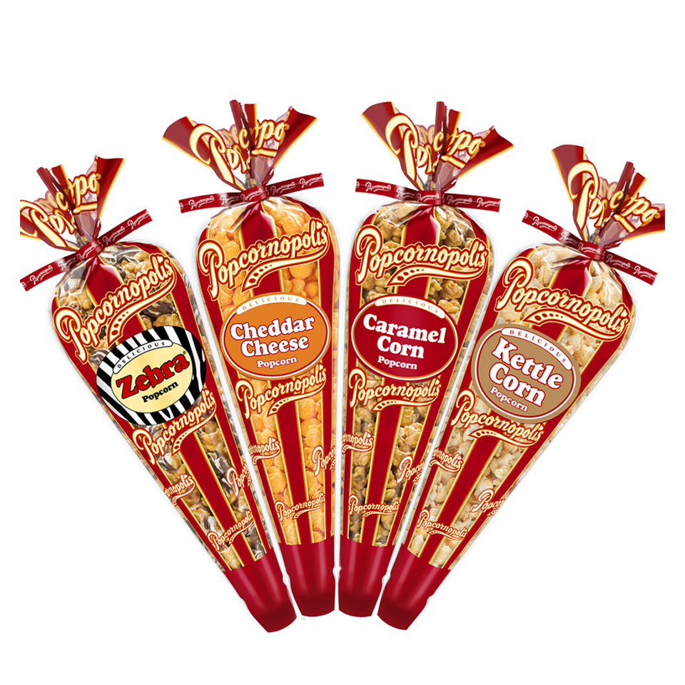Indulge in a cornucopia of flavor with Popcornopolis' irresistible collection of gourmet popcorn cones.
