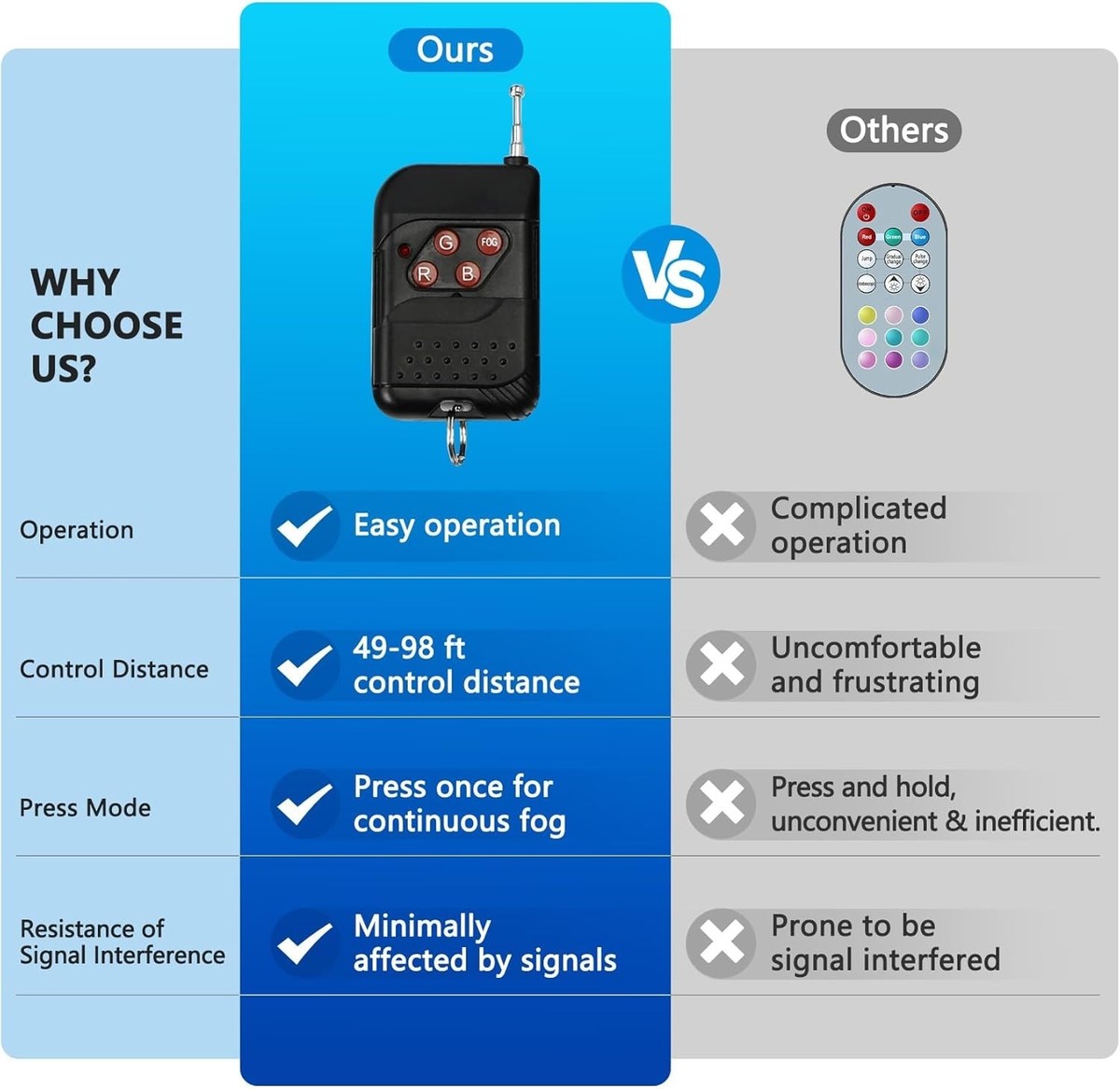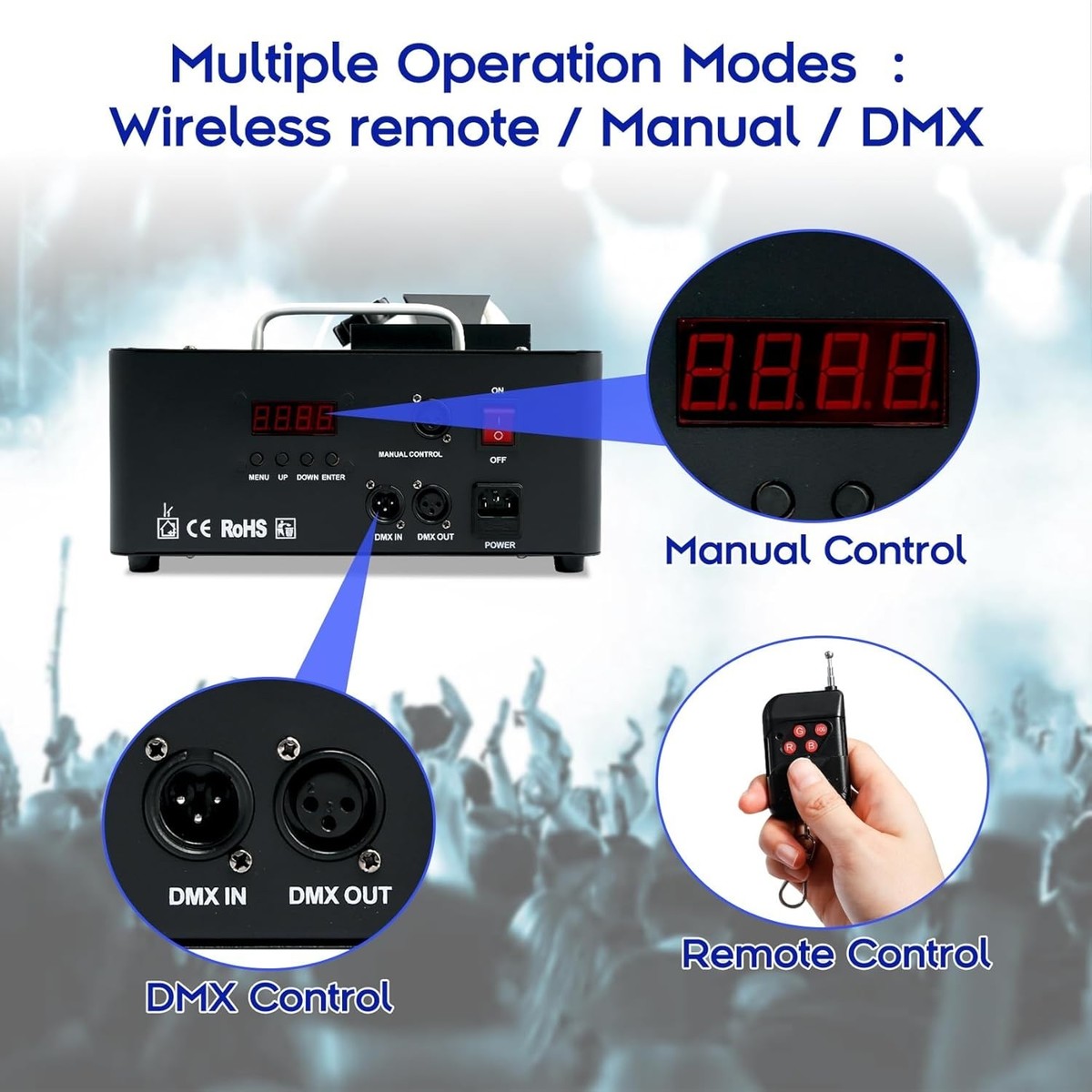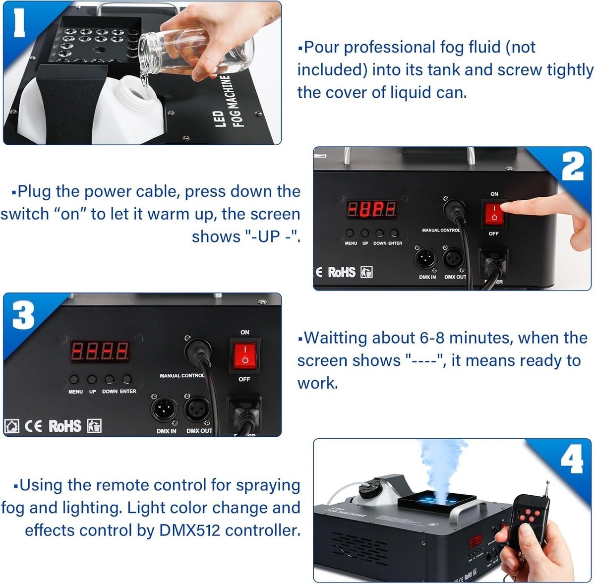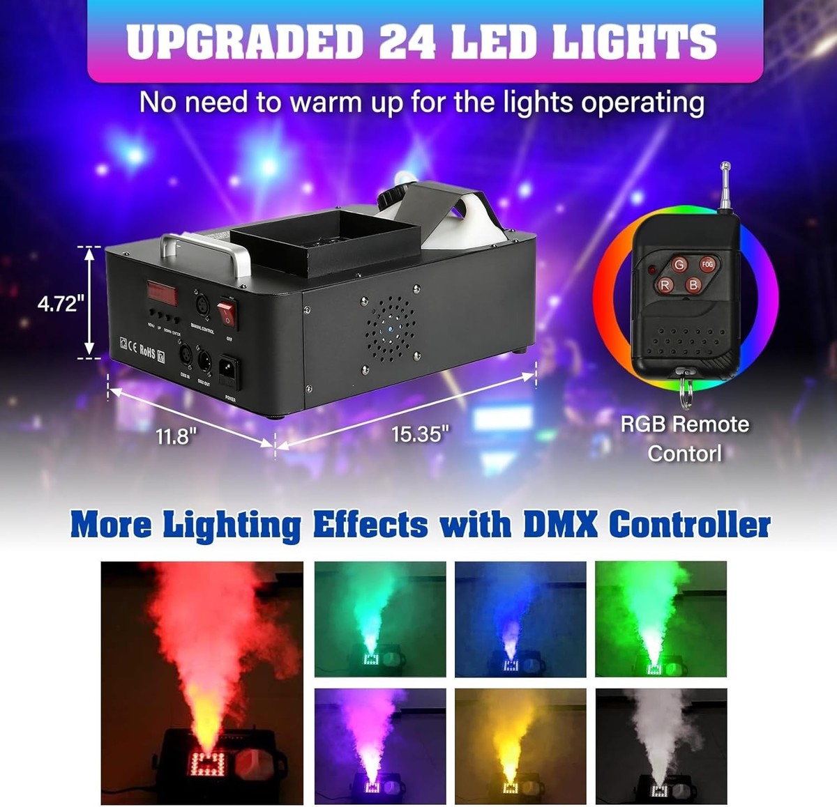 Remote Control DMX Function MENU: Light color change and fog can control by remote control. Equipped with DMX function and mune display screen for control and good show, we recommand using DMX512 contorller for controling fog and lighting effects (package not included).