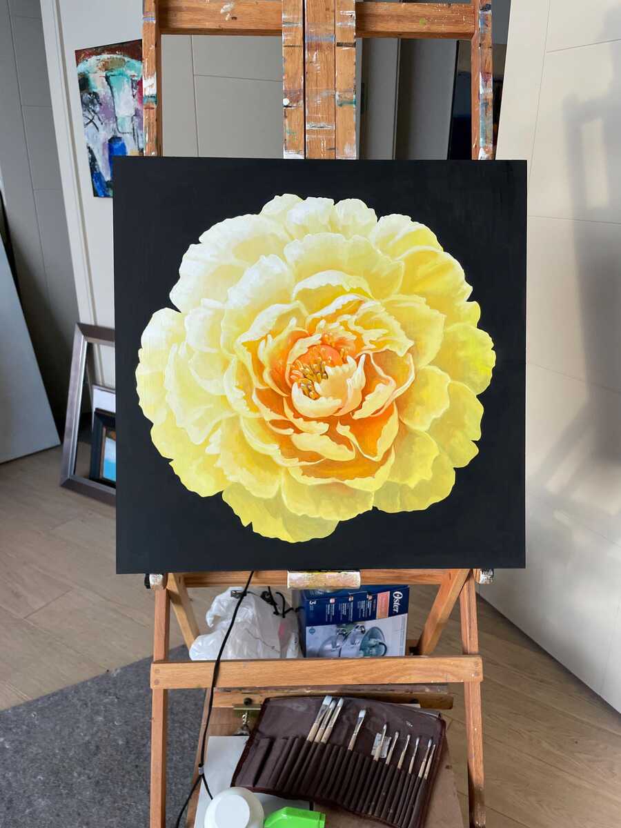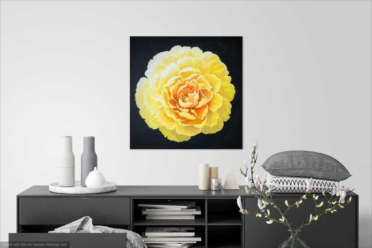 This stunning painting captures the elegance and warmth of a golden-yellow peony in full bloom. The intricate layers of petals glow with soft gradients of yellow and orange, radiating from a vibrant center that exudes energy and life. Set against a bold black background, the flower's luminous beauty takes center stage, making it a captivating focal point for any room.