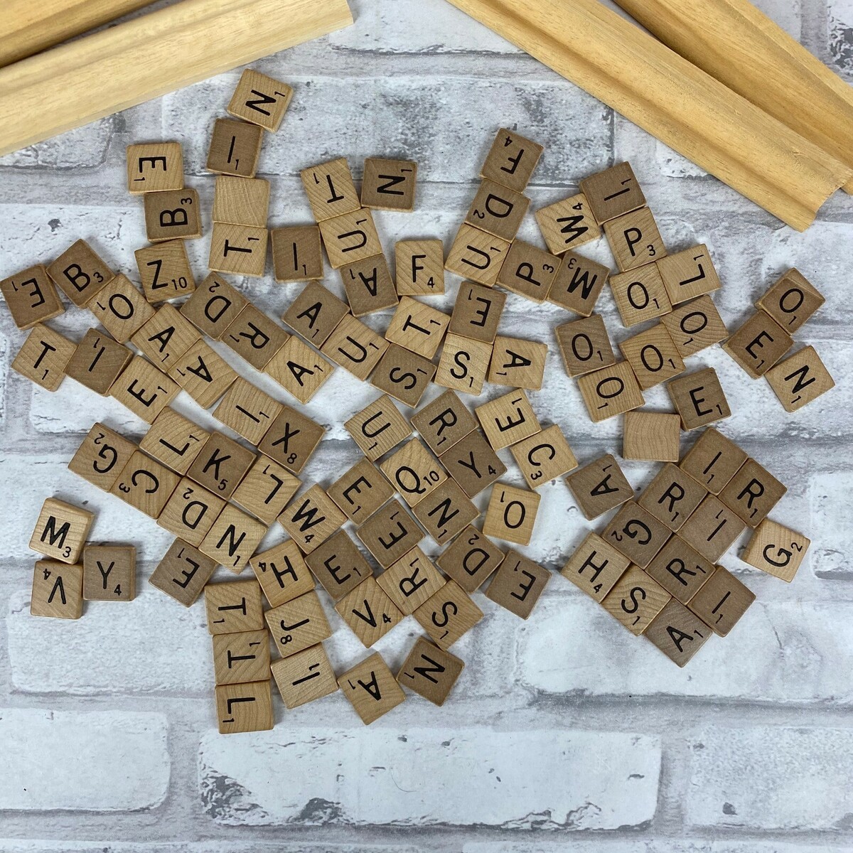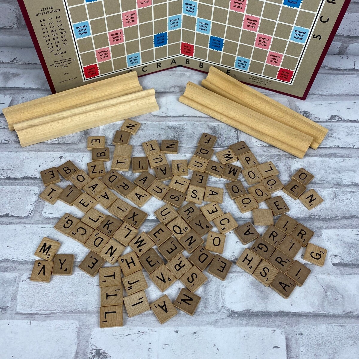 Includes original box, game board, 4 wooden tile racks, 100 tiles, tile bag.