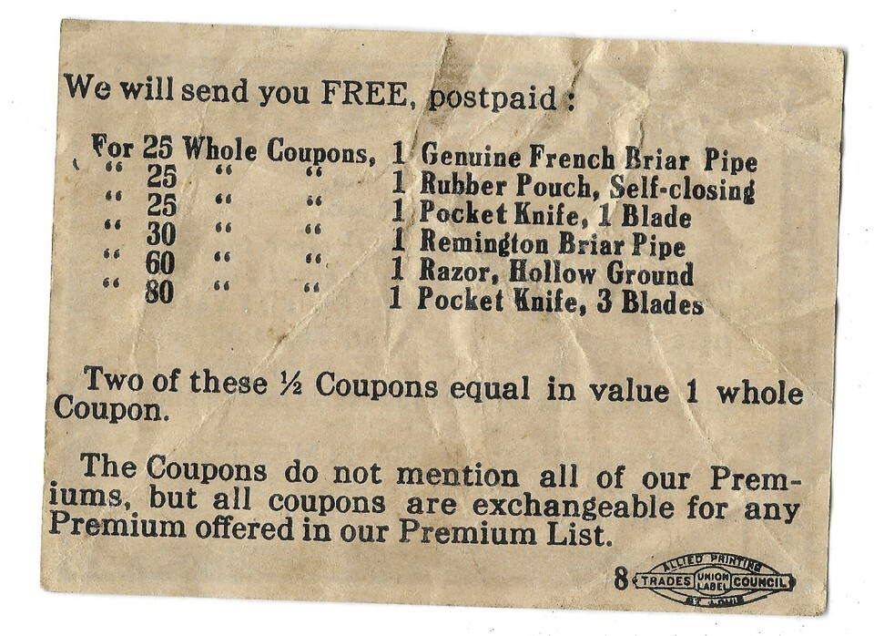 Features Allied Printing Union Label and list of premiums that coupons could be exchanged for.