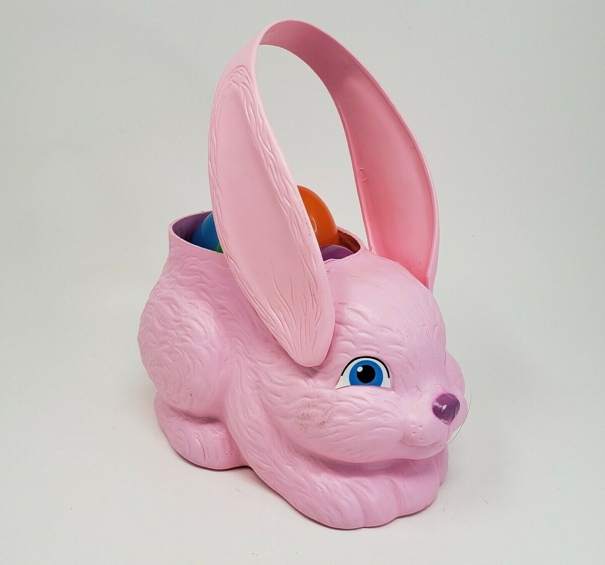 VINTAGE 1995 EMPIRE PINK BUNNY RABBIT PLASTIC EASTER BASKET BLOW MOLD W/ EGGS