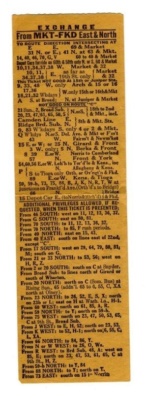 A Philadelphia Transportation Company EXCHANGE Ticket from Market Frankford, East and North. With restrictions and additional priviledges on the back. Measures about 6 1/4" x 1 7/8". Has not been punched.