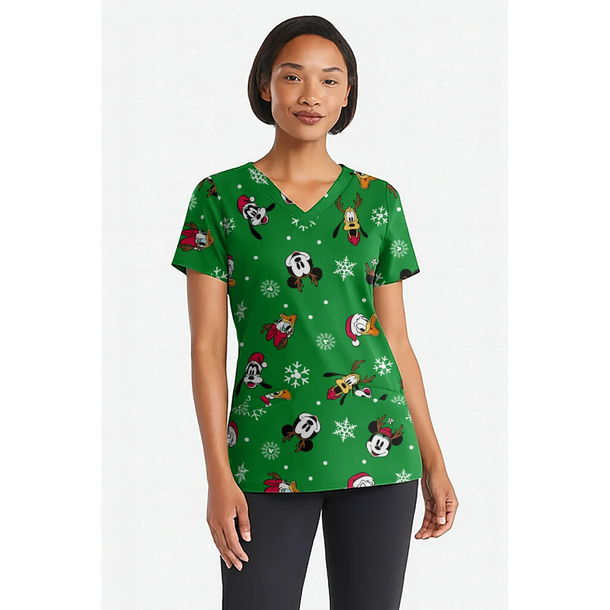 Add some fun to your holiday workwear with this Mickey Mouse Women's Scrub Top. This short sleeved, v-neck scrub top features a festive, colorful all-over print of Mickey Mouse. Made using recycled polyester, this scrub top has a comfortable fit with a soft hand feel, and is machine washable making it perfect for long shifts and everyday wear. Easy to care for and stylish, it?s a great addition to your workwear wardrobe.