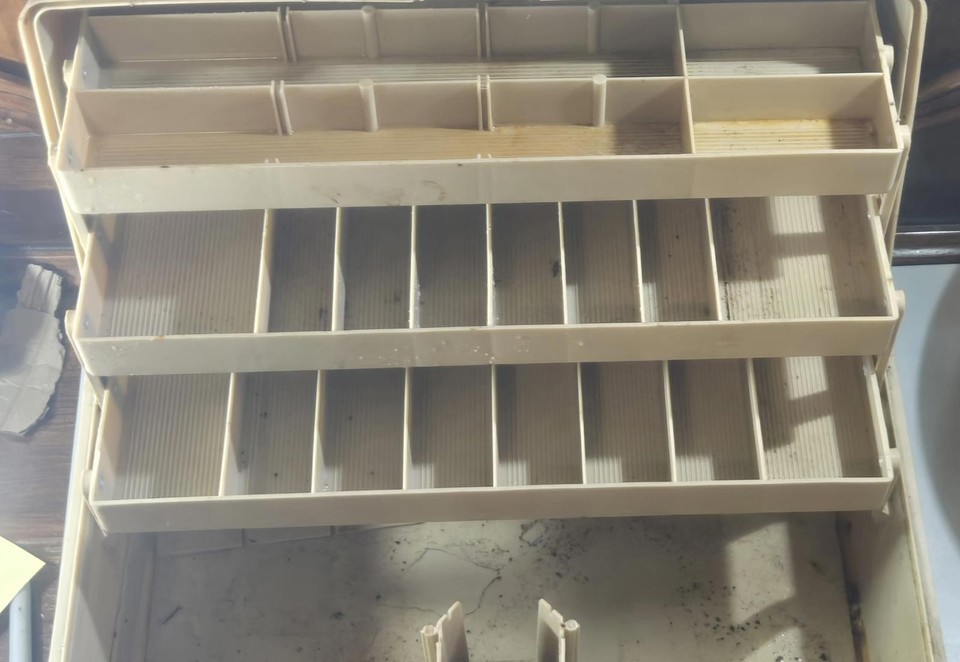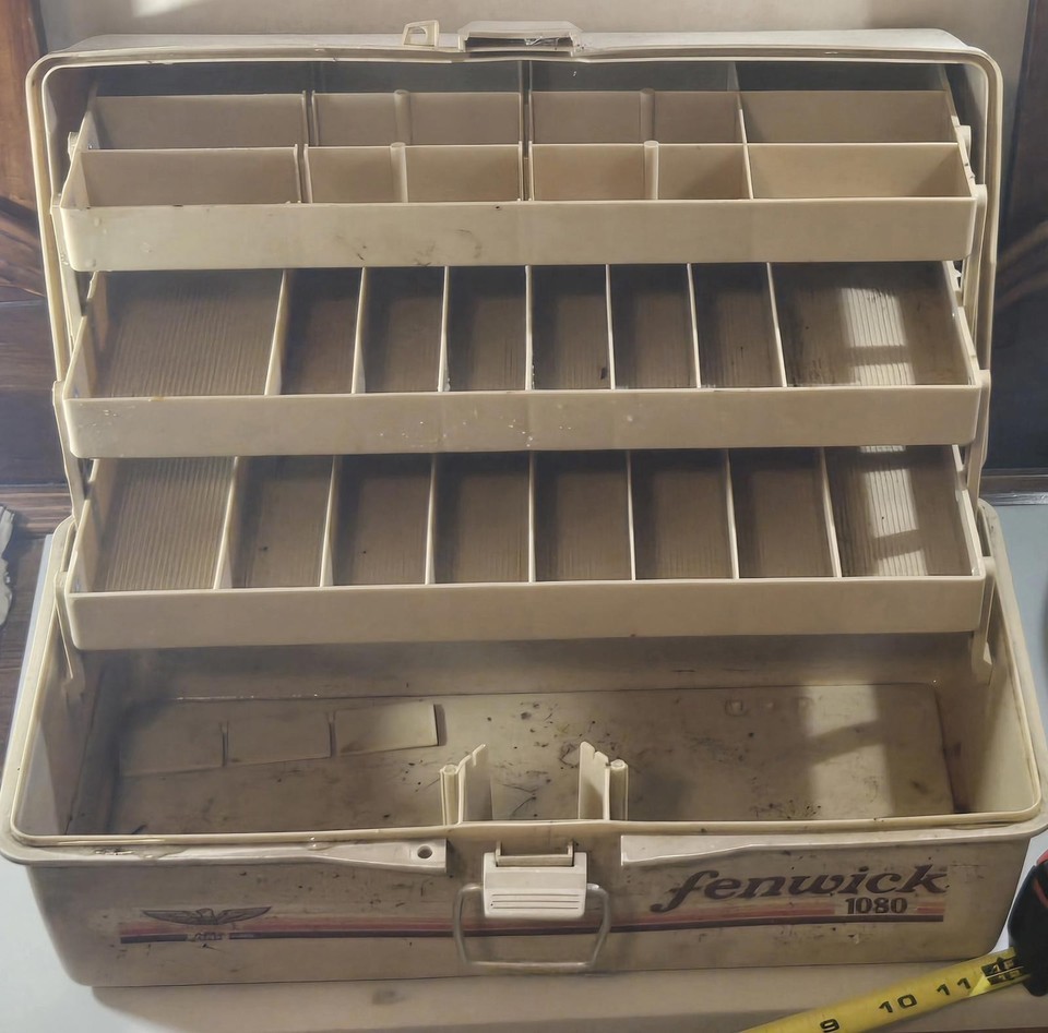 Vintage Fenwick 1080 Tackle Box with sturdy plastic construction.