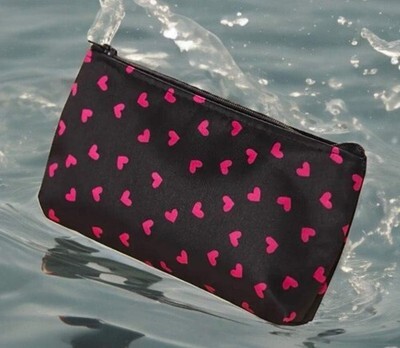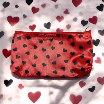 This compact zipper makeup bag features a playful heart pattern in black with pink accents, making it a fun and practical choice for everyday use or Valentine?s Day gifting. Its slim profile fits easily into a purse, tote, or luggage while keeping cosmetics and small essentials neatly contained. Ideal for makeup, toiletries, coins, earbuds, or travel organization.