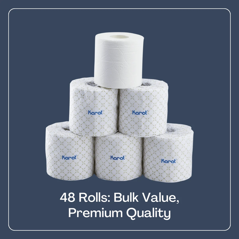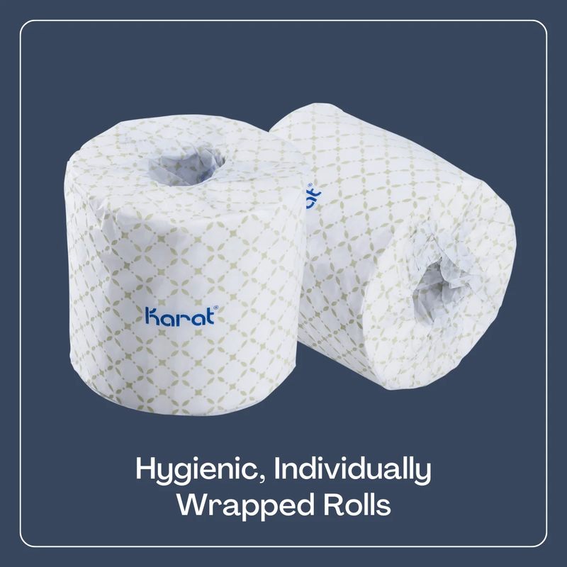 Enjoy the convenience and quality of Karat's 2-ply toilet paper rolls, designed for durability and comfort. Each case includes 48 individually wrapped rolls, ensuring hygiene and ease of storage. With 500 sheets per roll, you'll have an ample supply for all your household needs. Made from soft, yet sturdy paper, this unscented toilet paper is perforated for easy separation, offering a reliable and sanitary solution for your bathroom. Perfect for daily use, Karat toilet paper combines practicality and cleanliness for your comfort.