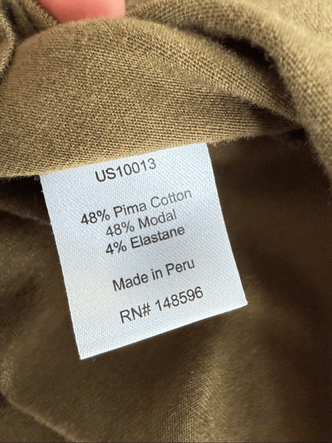 Universal Standard Olive green relaxed, round neck T-shirt in Pima cotton, modal and elastin blend. Laying flat measures approximately 26 inches shoulder and 19 inches armpit to armpit.