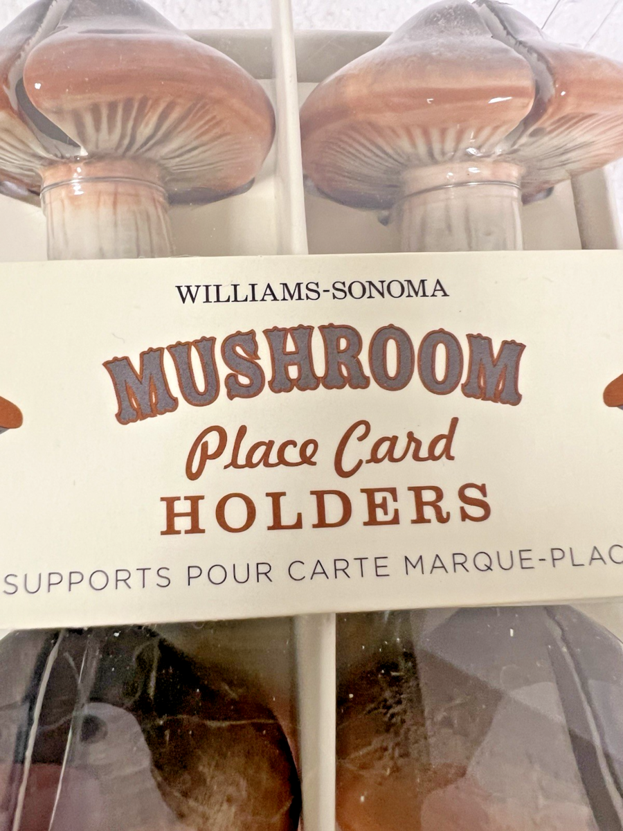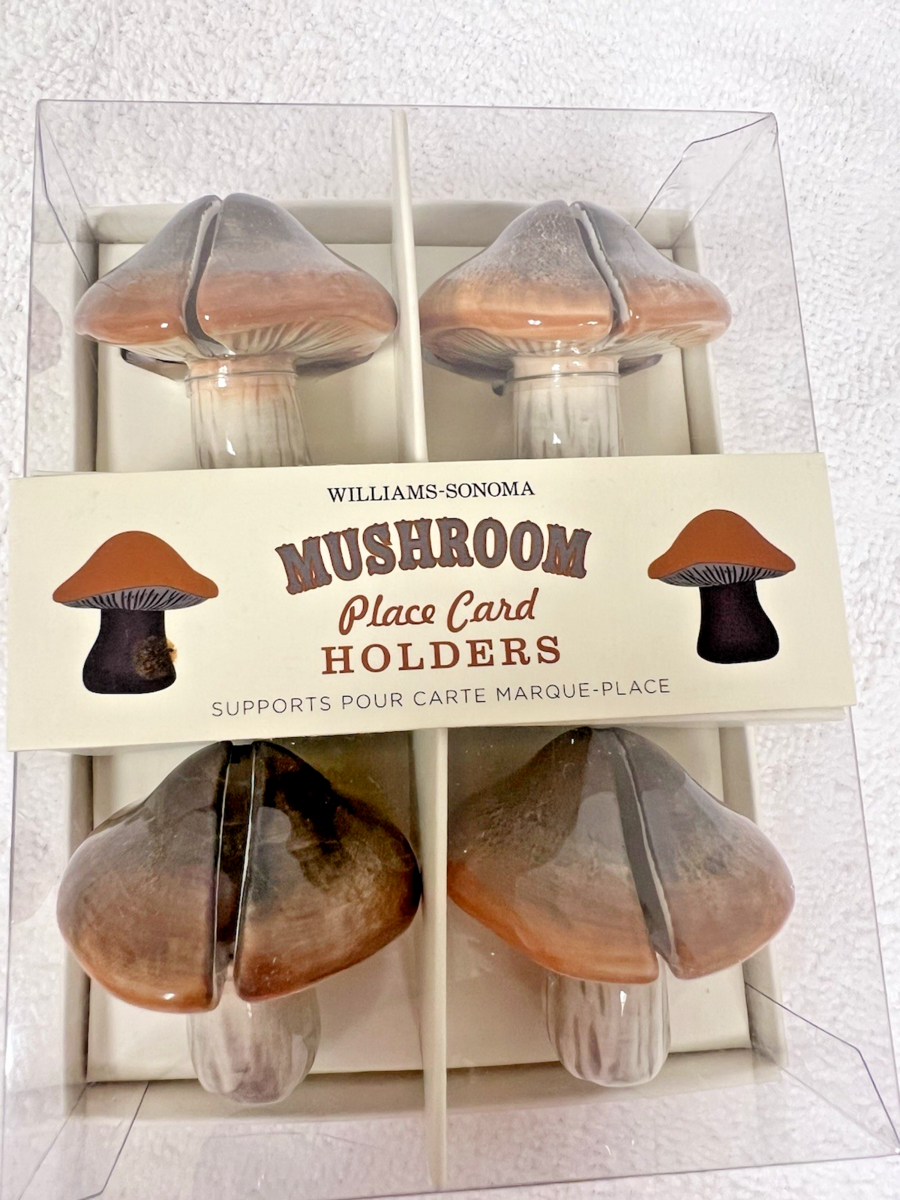 William Sonoma Mushroom Place Card Holder New in Box Set of 4 About 2" Long New in box they look never used So realistic and cute we have 2 boxes price is for 1