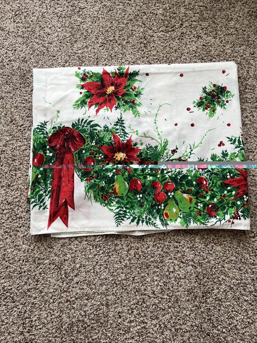 The Vintage Spring Mills Christmas Red Poinsettia Bows Tablecloth is a festive and charming addition to any holiday table setting. Featuring a classic poinsettia, berries, and bow design in red and green on a white background, this 94" x 70" rectangular tablecloth is made of soft cotton material. Perfect for Christmas celebrations, this original tablecloth captures the spirit of the holiday season with its traditional and timeless design.