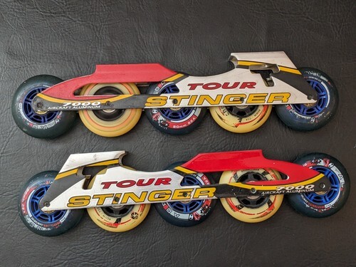 Up for sale is a used set of Tour Stinger 7000 Inline Roller Aircraft Aluminum Frame 5 Wheels Bearing Blades.