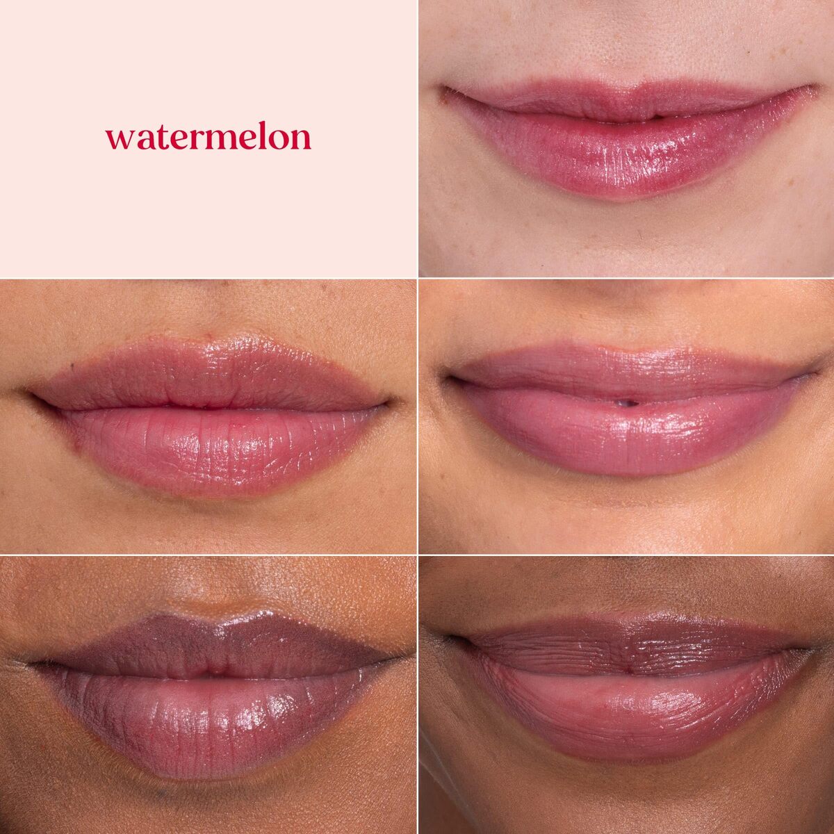 warm, luminescent shade of Burts Bees Lip Shimmer Watermelon enhances natural