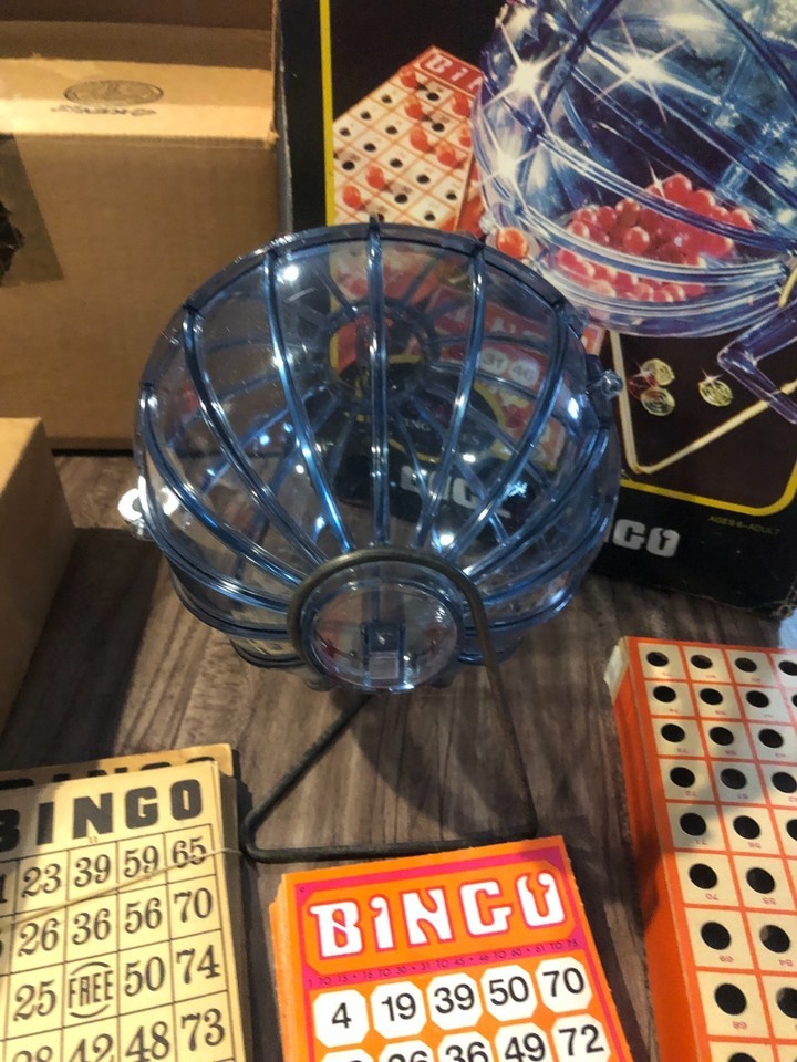 This is a Vintage HASBRO World Of Family Fun CAGE BINGO Game Set from 1971 . It is in great condition with the original box and packing. The Box does has some very minor wear. Includes 75 Balls, Master Bingo Card, and two sets of bingo cards. There are not any plastic markers, but you can get them online cheap. Very Nice Original Vintage Set!! Combine auctions to save on shipping. EAG