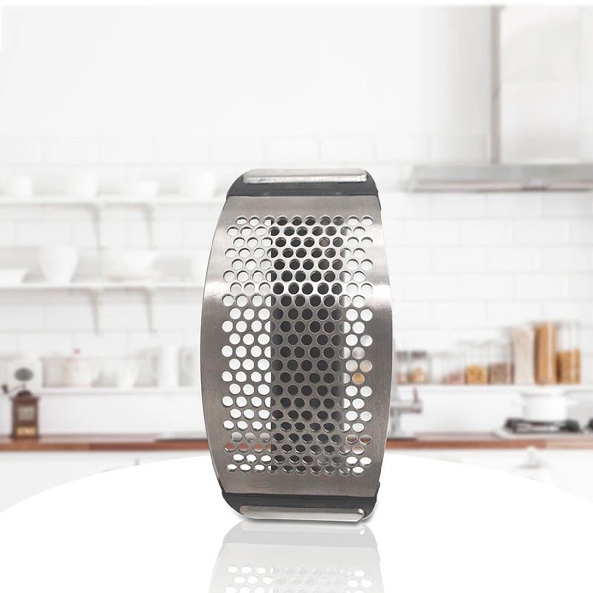 This kitchen tool is a manual garlic press crusher made of stainless steel, featuring a sleek silver color. The masher is easy to clean and provides a convenient way to crush garlic. With a simple design and durable material, this garlic press is a practical addition to any kitchen for efficiently preparing meals.