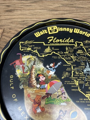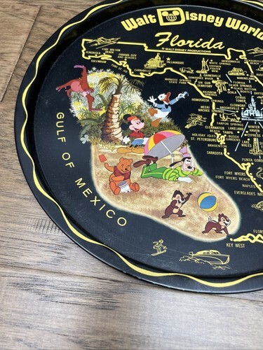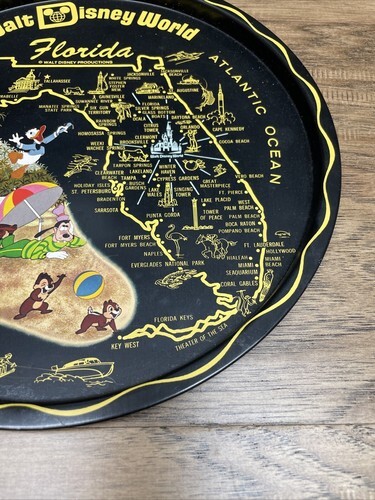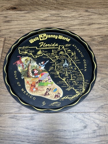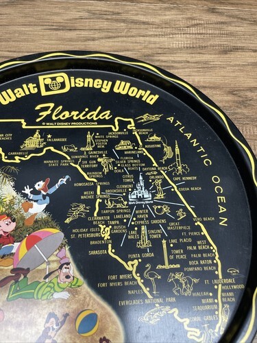 Vintage 1970s Walt Disney World Florida Map Souvenir 10” Black Metal Tray KG JD