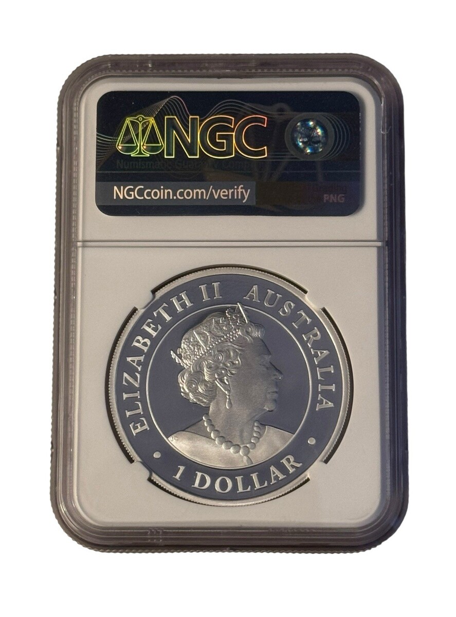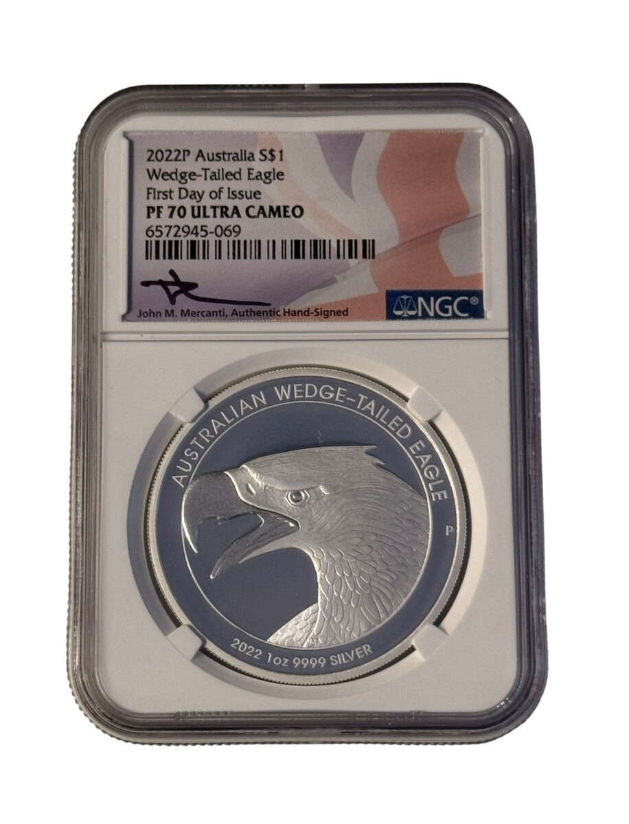 2022-P Australia $1 Wedge-Tailed Eagle Silver Proof graded PF70 Ultra Cameo by NGC. First Day of Issue example with authentic John M. Mercanti hand-signed NGC label. Struck in 1 troy ounce of .9999 fine silver with exceptional deep cameo contrast and flawless surfaces. Features the iconic Australian Wedge-Tailed Eagle design paired with the Queen Elizabeth II obverse. NGC holder with verification hologram and serial number visible. Premium modern world silver issue combining top-population grade, First Day designation, and Mercanti signature appeal. Ideal for advanced collectors and silver investors seeking the highest quality presentation.